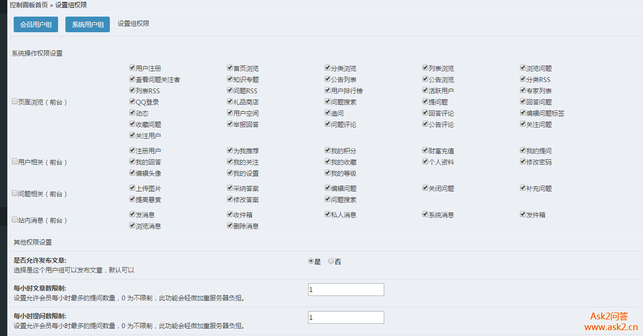 Ask2问答系统每个页面采用全新控制,严格的过滤机制,如果用户要访问某个页面后台必须授权给他这个访问的权限,用户对应用户组: