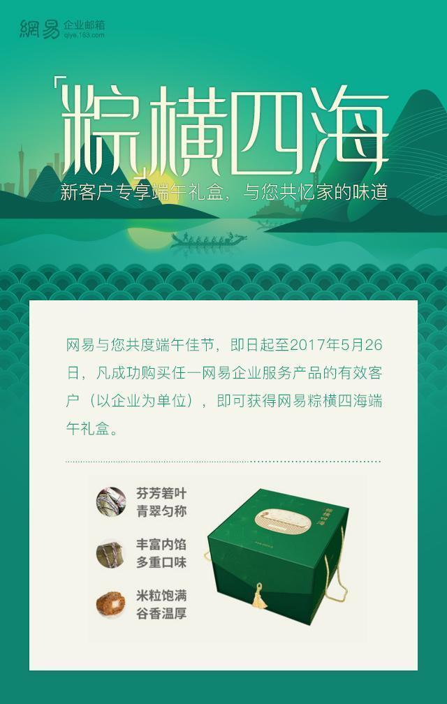 端午佳节将近,网易与您共度佳节!即日起至2017年5月26日,凡成功购买任一网易企业服务产品的有效客户(以企业为单位),即可获得网易粽横四海端午礼盒。登记页面:163.hn.cn