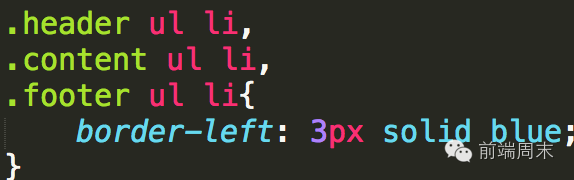 图中这种情况不多见,此处只是举个例子,这里写了三组选择器,用来定义不同地方的同一种样式,其明显的缺陷是,如果有第四个地方需要使用到,你不得不再往里加一组选择器,如果有10个不同的地方,你就写10个?这对于维护来说,是很痛苦的,聪明的我们,怎能被如此繁复又不必要的劳动所困扰,故而,墙裂不推荐此种做法,完全可以提取出来一个公用类,定义统一样式,然后,哪里需要放哪里,复用和维护都会更加方便。
