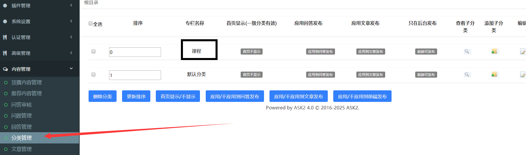 进入后台分类管理中,新建一个一级分类叫:课程