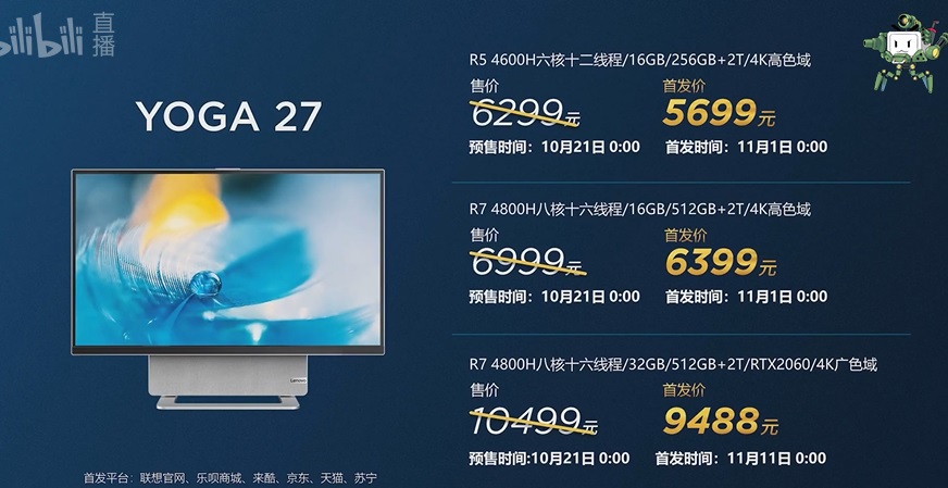 10 月 20 日晚,联想发布了 YOGA 27 一体机,搭载了 27 英寸 4K 屏,可选 AMD R5 和 R7 标压处理器,显卡可选 RTX 2060,售价 5699 元起。