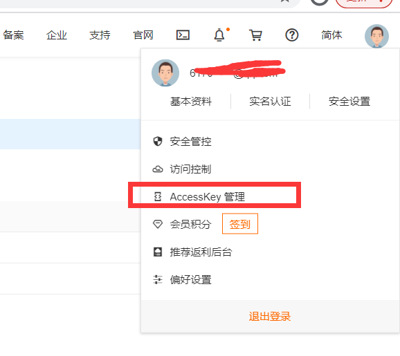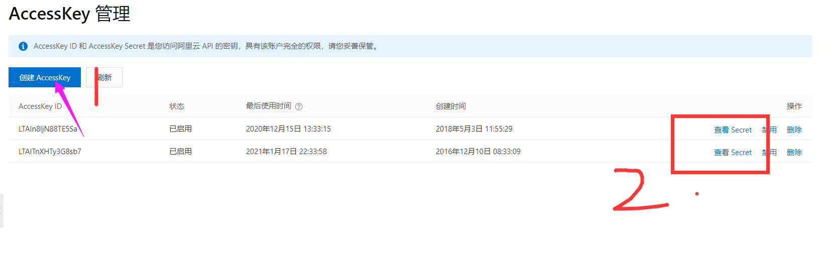 如果没有accessKey就点击创建,如果有就复制一份,数字2处复制密钥值,需要验证手机号提交后查看密钥值。