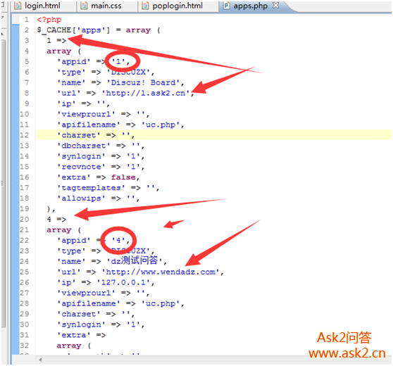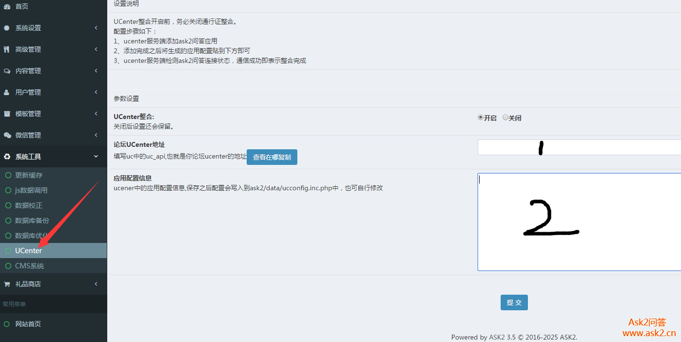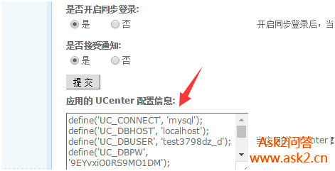 因为ucenter的整合是基于uid和username的,因此必须要保证ucenter_server和整合的应用中的用户uid保持一致。因此需要确认ucenter的ucenter_members表中的uid自增与ask2用户表中的自增条件没有冲突,最好方式就是将下一个自增值调整大一些,避免造成uid不一致的情况。如果有这种情况,收到到ucenter_server的数据库中执行如下sql即可