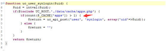 注意,if(count($_CACHE['apps']) > 1) 如果应用大于1才执行这个同步登录代码。