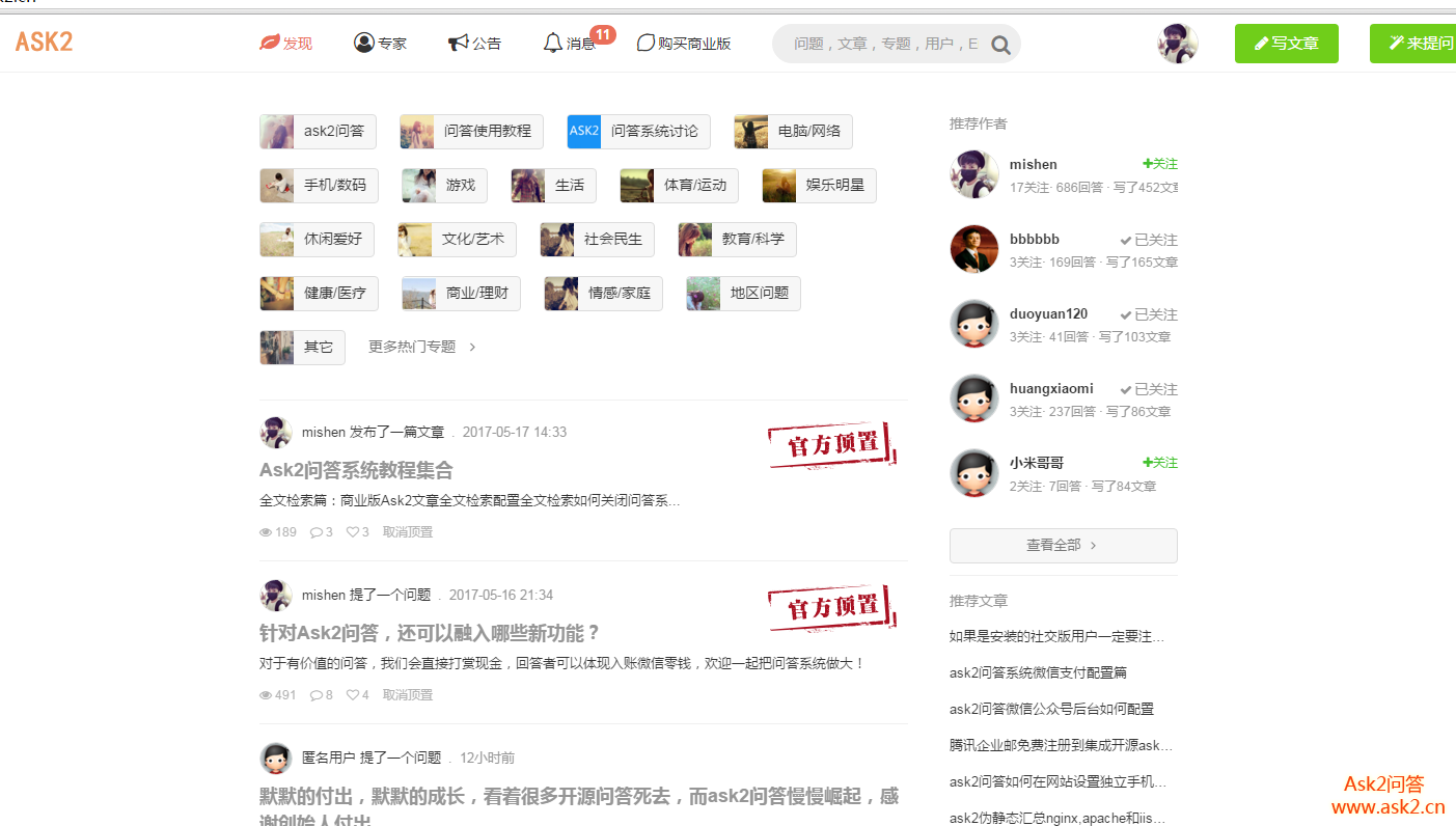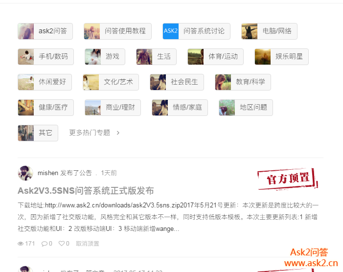 http://www.ask2.cn/downloads/ask2V3.5.1sns.zip2017年5月21号更新:本次更新是跨度比较大的一次,因为新增了社交版功能,风格完全和其它版本不一样,同时支持低版本模板。本次主要更新列表:1 新增社交版功能和UI:2 改版移动端UI:3 移动端新增wangeditor编...