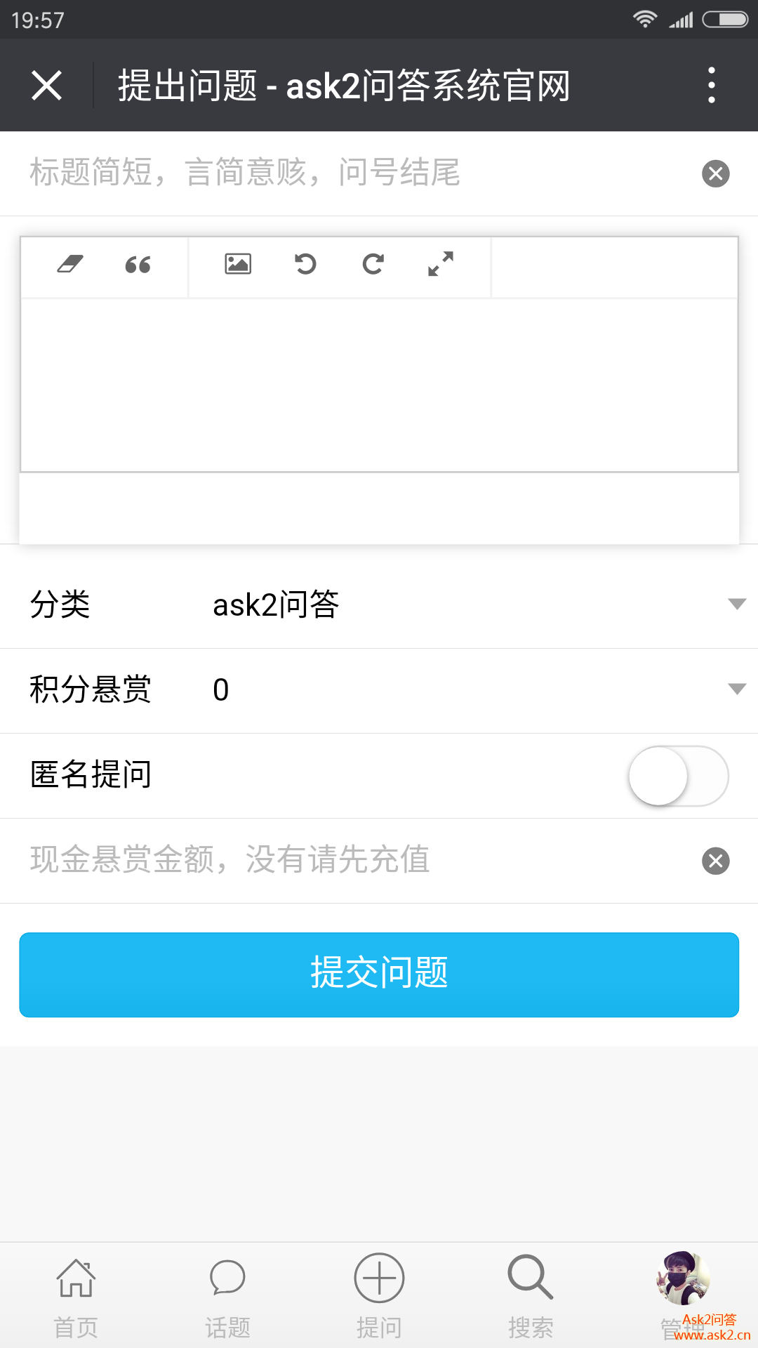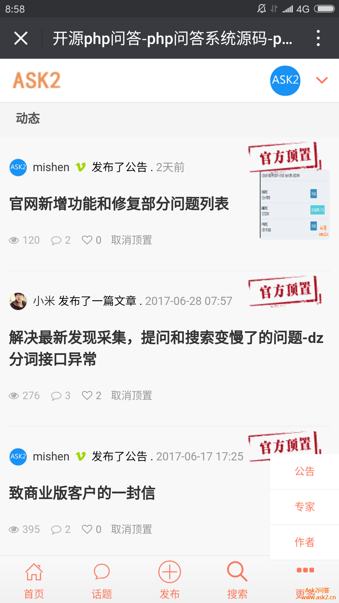 V3.5.1更新包下载地址:http://www.ask2.cn/downloads/Ask2V3.5.1SNS_update.zip 修复3.5发布带来的问题,此更新包里有更新方法。5月24更新:1 增加语音文件本地化mp3存储2 修复文章编辑器wangeditor获取不到编辑内容3 修复百度编辑器下提问页面无法提交问题4...