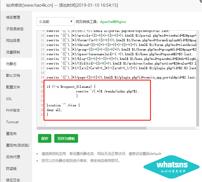 以上是伪静态规则,用的是宝塔面板,如下图