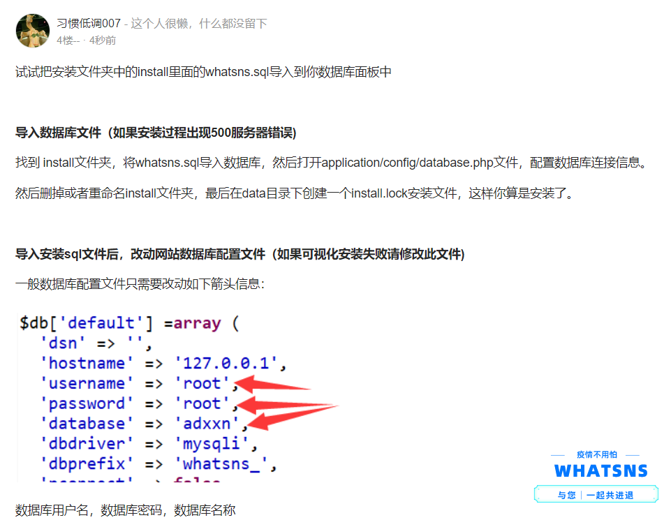 找到 install文件夹,将whatsns.sql导入数据库,然后打开application/config/database.php文件,配置数据库连接信息。