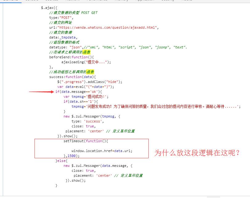 在add.html页面的function tijiao()函数,question/ajaxadd返回成功后,又延时回调了ajax请求,为什么呢?求解释。setTimeout(function(){ [removed].href=data.url;},1500);