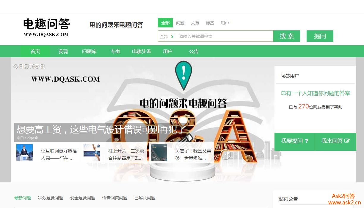 电趣问答网很荣幸采用了ASK2系统来做电气知识问答网站。希望ASK2越来越好,我们也越来越好。演示地址www.dqask.com